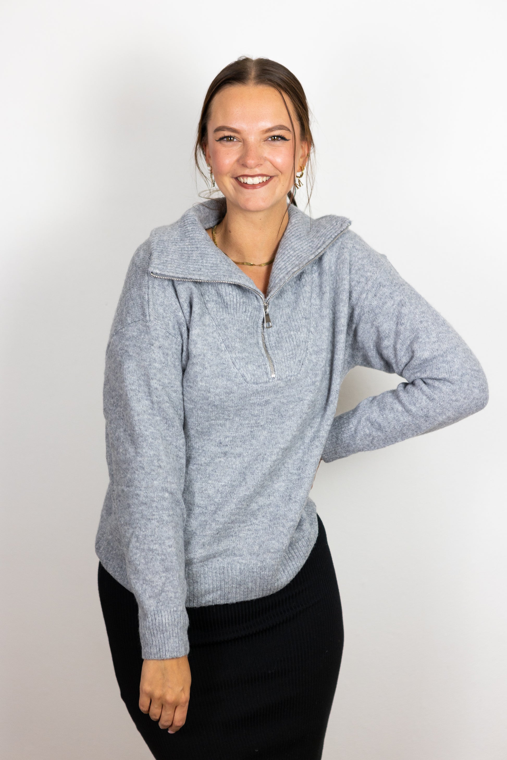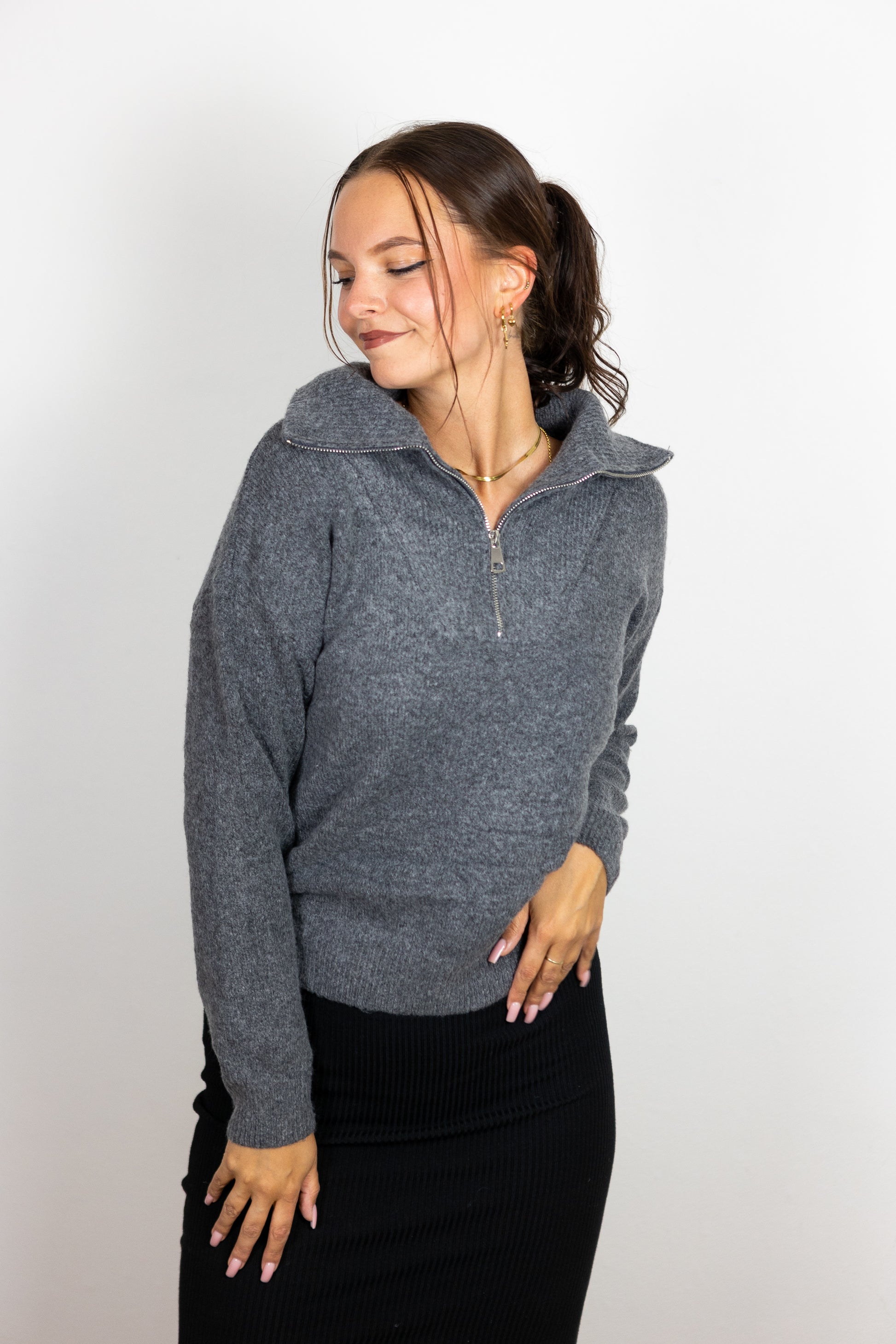 Unser Half-Zip Pulli “Kira” ist ein Must-Have. Der Stoff kratzt nicht und ist super weich, der Schnitt ist nicht zu lang (perfekt für High Waist Jeans, Leggins oder Röcke) und recht gerade.